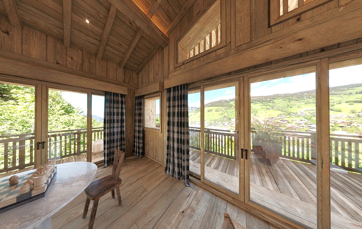 Designed with traditional Megeve architecure and materials that include old wood and lime painted facades as well as wooden tiles and copper gutters and channels, inside old wood panelling can be found throughout the chalet as well as parquet flooring in the bedrooms and living rooms. Underfloor heating with heat pump, a fully fitted kitchen and a fireplace in the living room are just some of the other high end finishes you can expect.