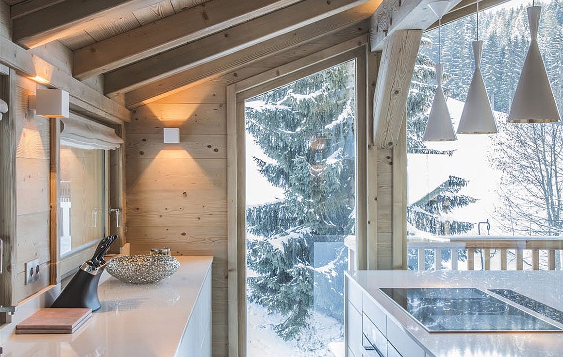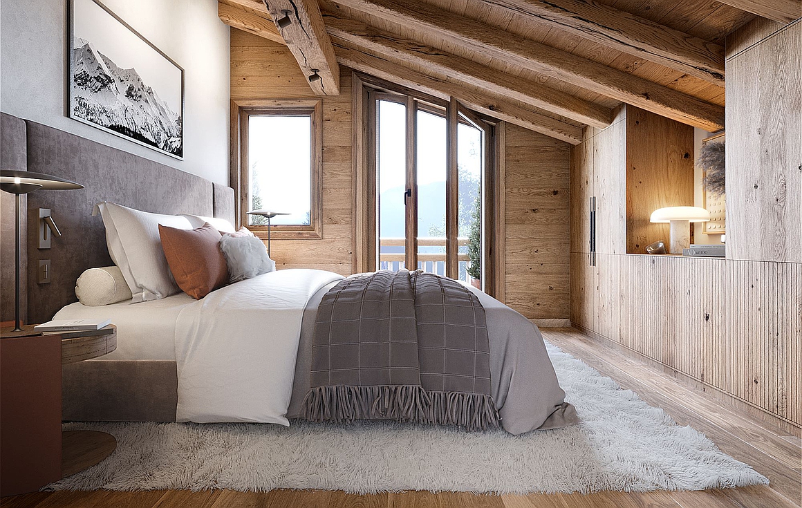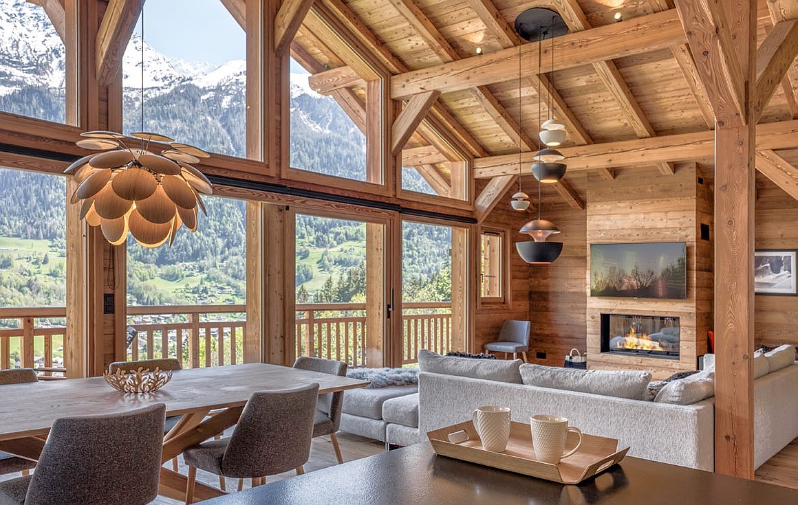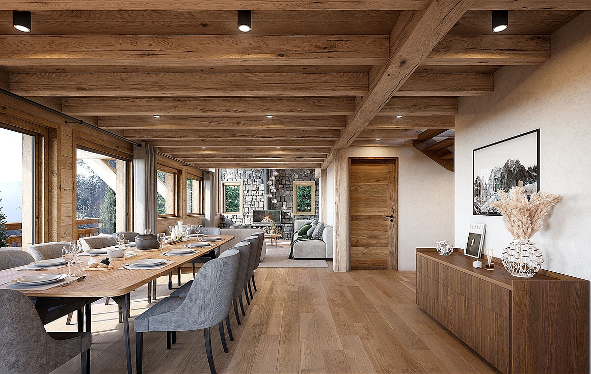 For layout, the chalet will enjoy 4 comfortable en-suite bedrooms, wellness area complete with sauna, hammam and gym, its own wine cellar/bar, TV / home cinema room, 2 car garage, ski room, huge open plan living floor with cathedral ceiling, fireplace and access to the grand 34m2 terrace.