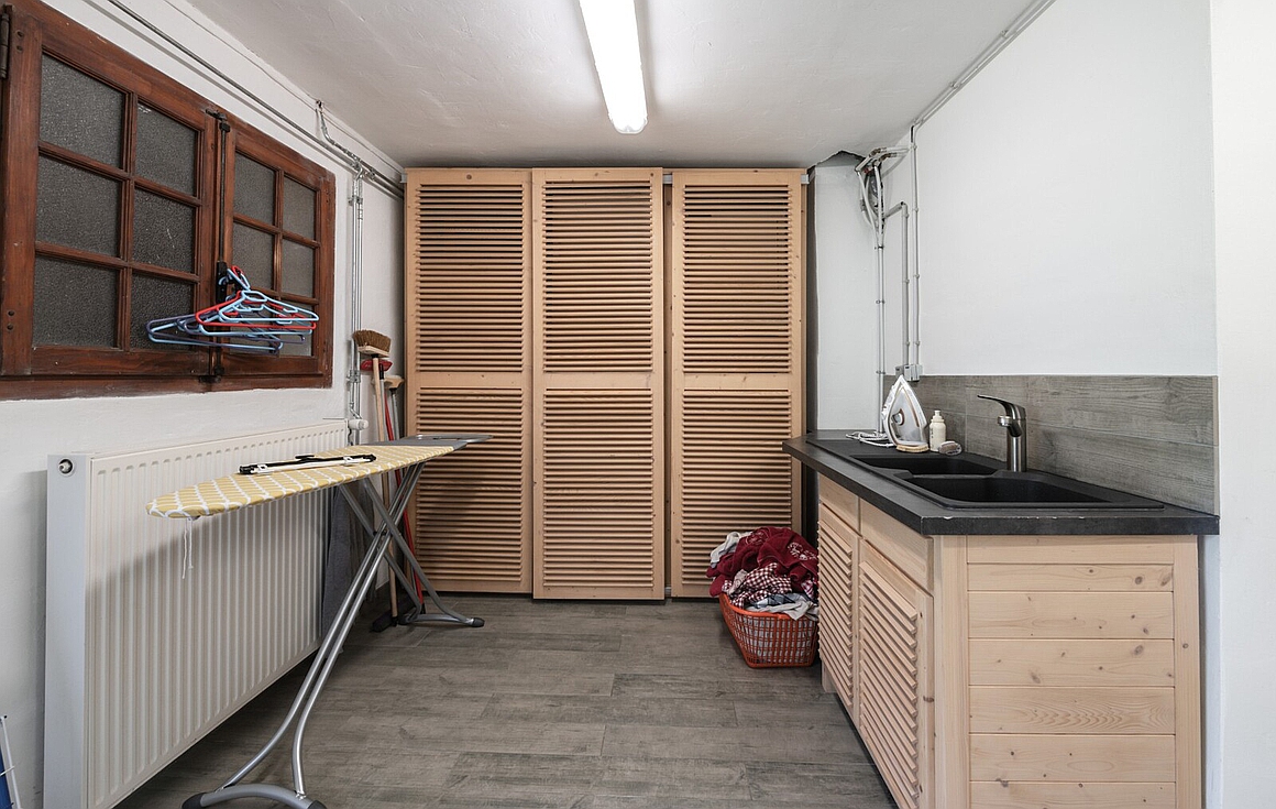 On the garden level, an independent three-bedroom apartment awaits renovation, featuring its own bathroom, separate toilet, and private access. Additionally, a laundry room and a versatile 70 m² space provide the opportunity to create additional living areas, a home office, or a recreational space.