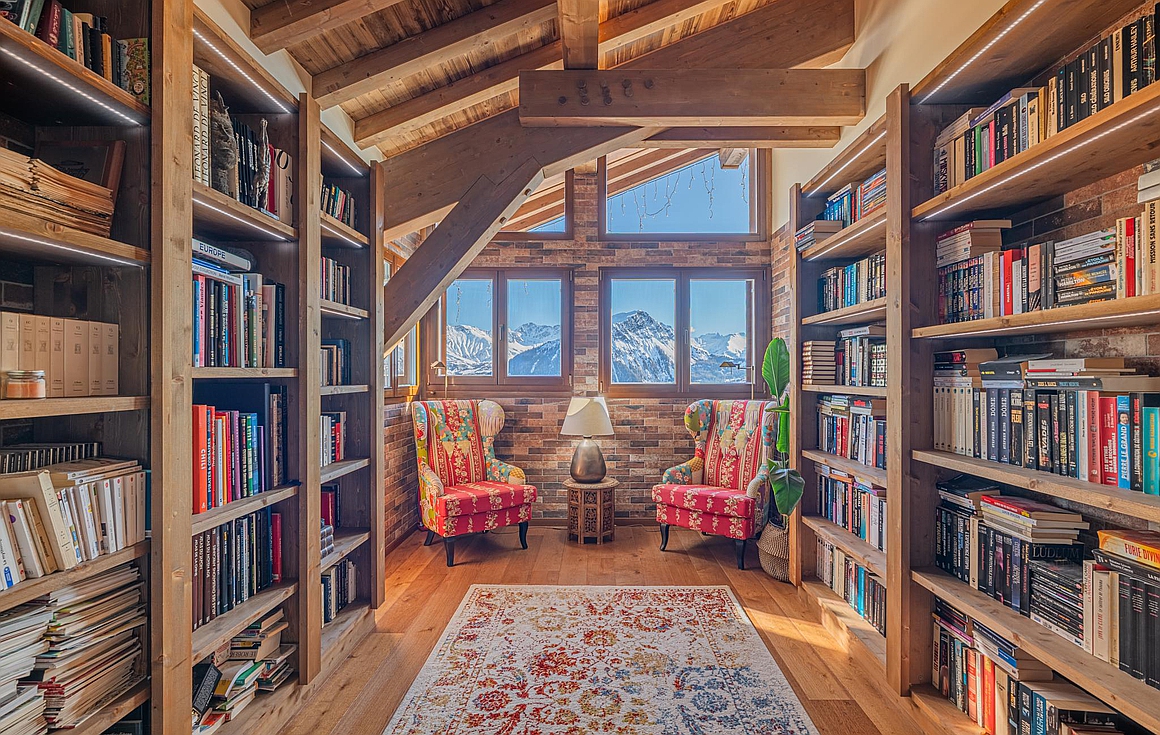 Within the chalet itself, you will find a lift connecting all floors at the end of the wide entrance hall which welcomes you into this incredible property. The 100m2 living floor comes with an amazing double height ceiling, open plan lounge with fireplace, dining area and kitchen with central island. The wall of panoramic windows creates a wonderful light and airy interior to enjoy the alpine peaks. While an additional TV lounge, bar and libraryof 32m2 completes this floor.