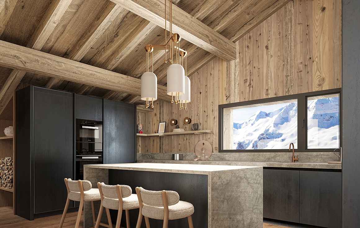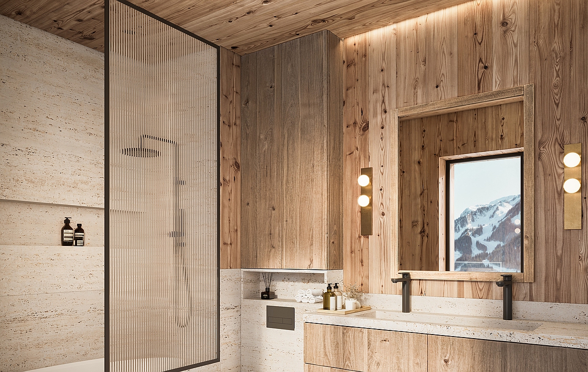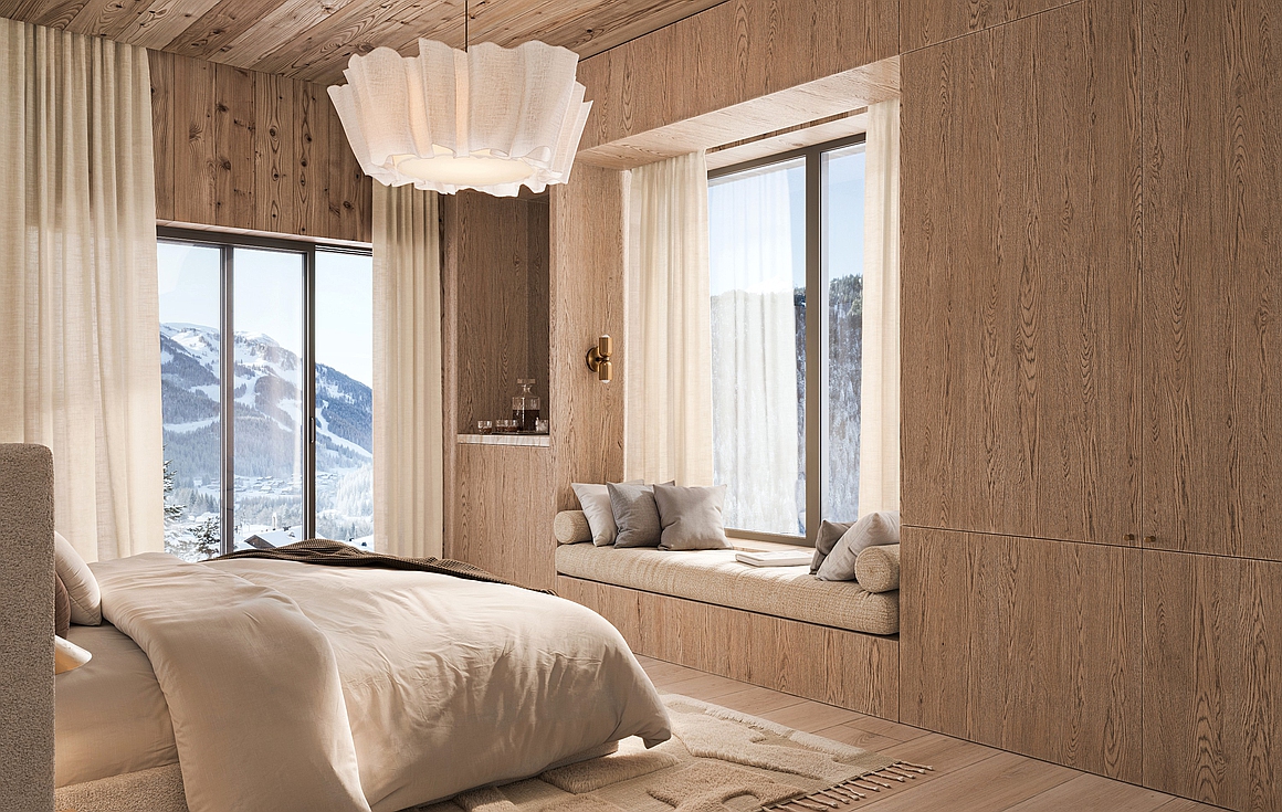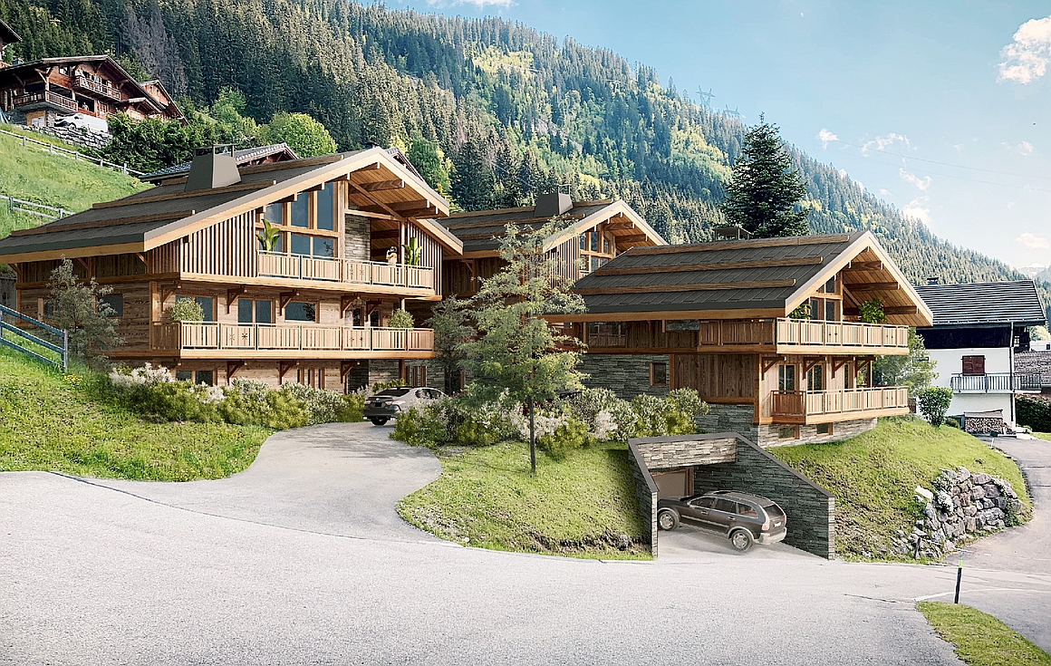 Encompassing modern alpine architecture with impeccable finishes throughout, the exteriors will mix wood and stone in perfect harmony. Inside, the contemporary feel will be emphasised by the floor to ceiling windows, parquet flooring in living areas and bedrooms as well as heat pump with underfloor heating. The photos shown are previous examples of construction in the resort.