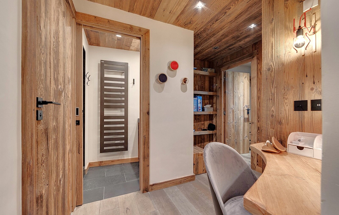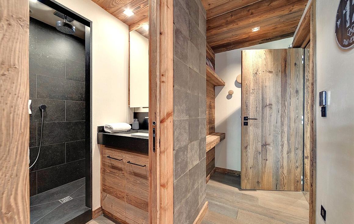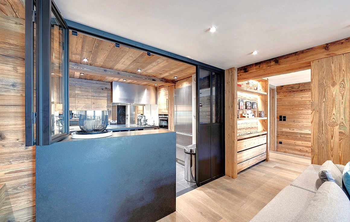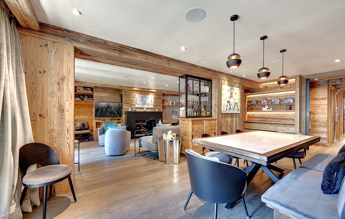With a sunny aspect thanks to the south facing orientation, the interiors are filled with natural light throughout the day. The spacious living room, complete with a fireplace, creates a welcoming space to relax after time on the slopes. A fully equipped open-plan kitchen flows into the dining area, making it ideal for hosting family and friends. The use of high-quality materials and tasteful décor gives the property a warm and inviting atmosphere.