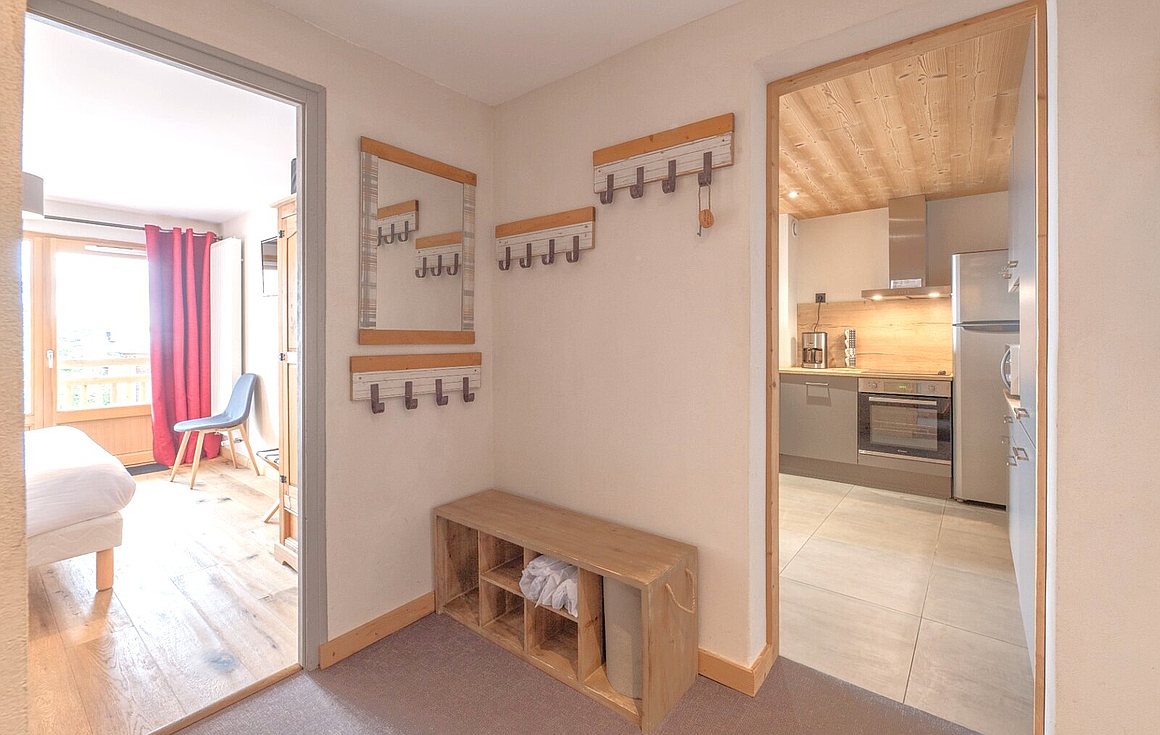 One of the apartment’s highlights is its large south-facing wraparound balcony, where you can breathe in the fresh mountain air and admire panoramic views of snow-covered peaks. Practical features include a shared ski room and a private parking space, giving you everything you need for an effortless stay.