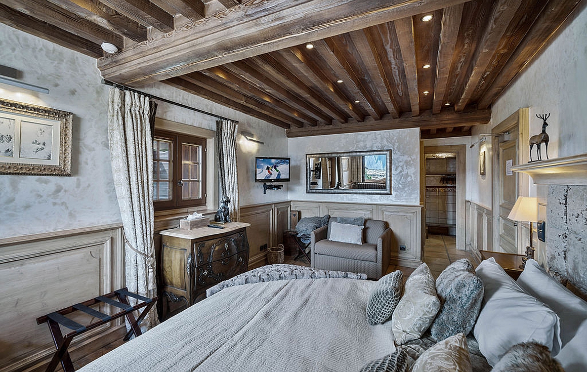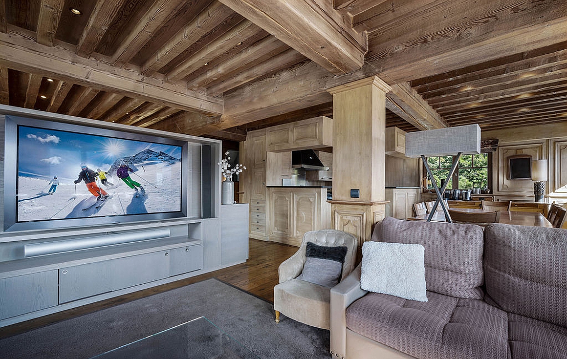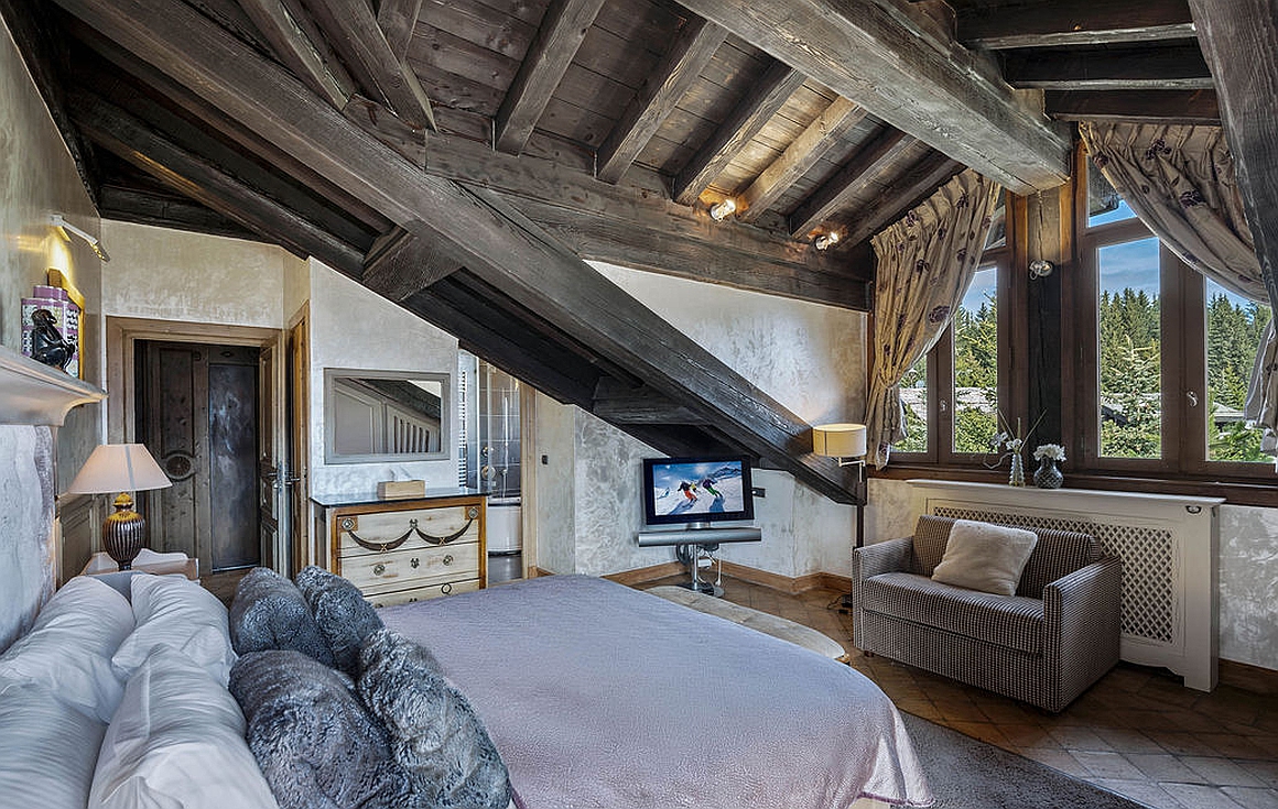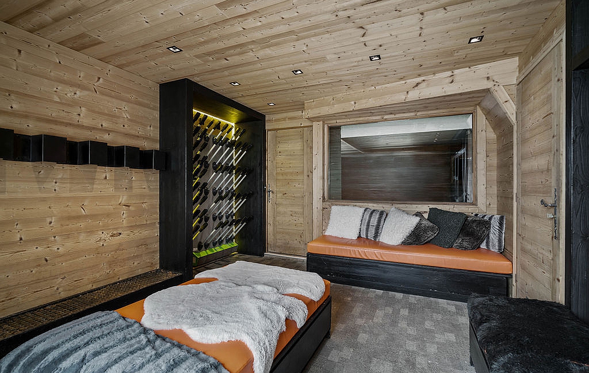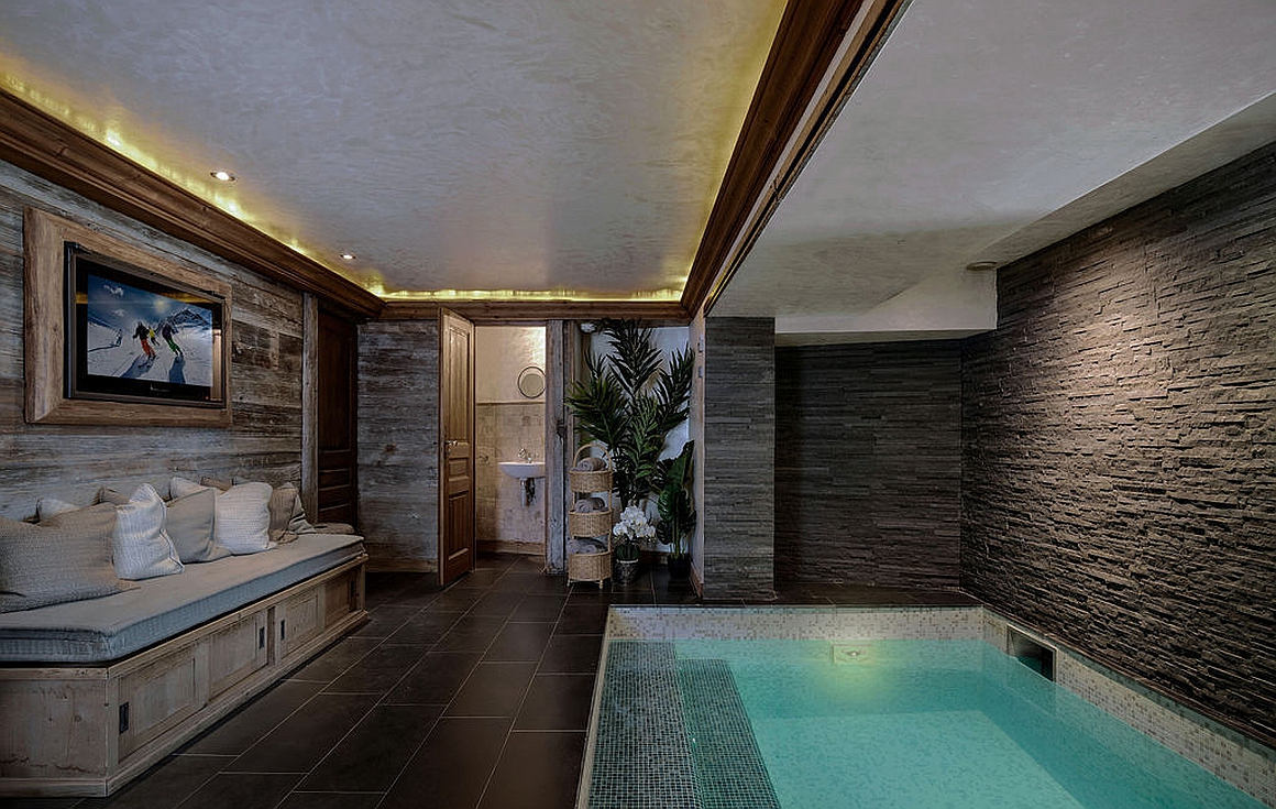 The chalet extends its appeal with balconies offering open views of the surrounding peaks, while a private wellness area with swimming pool and sauna ensures relaxation continues long after the day’s adventures. A massage room, ski room, and technical areas add to the convenience of this remarkable property.