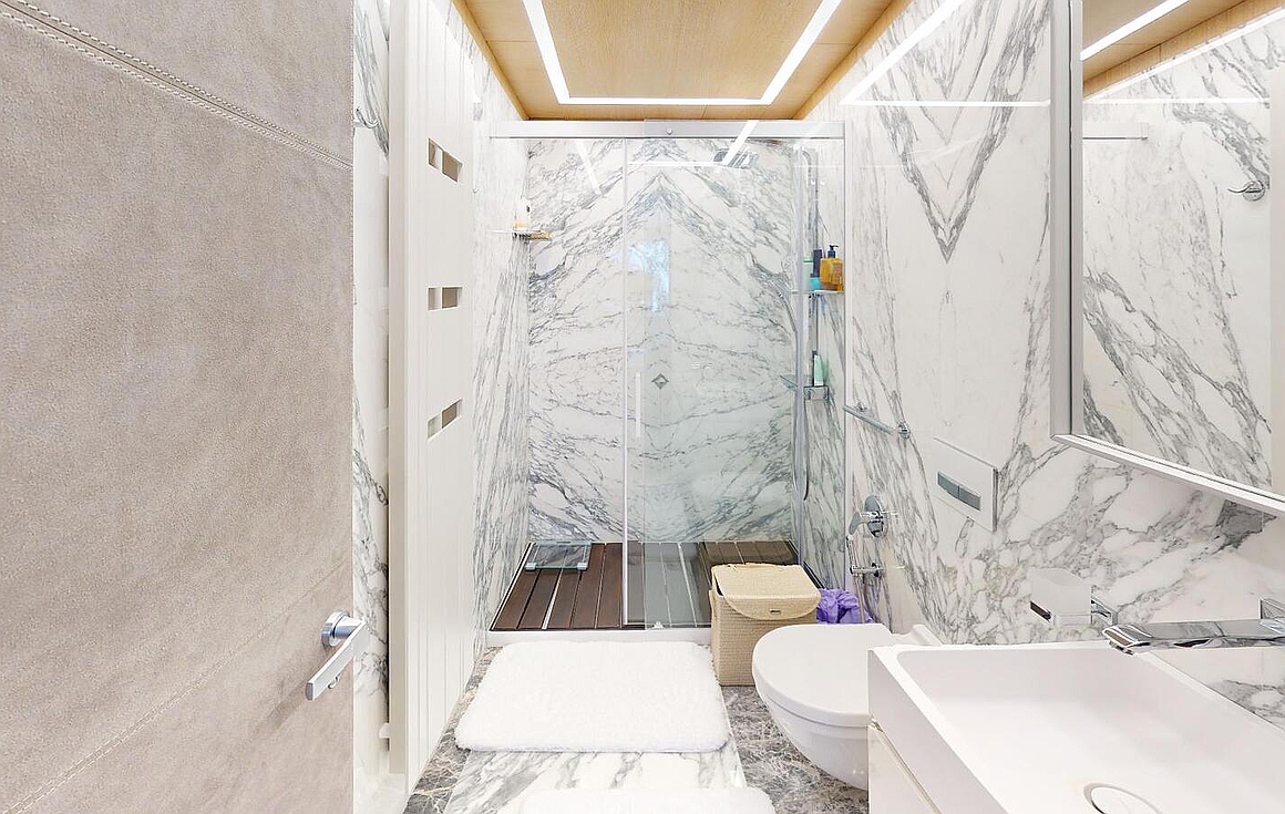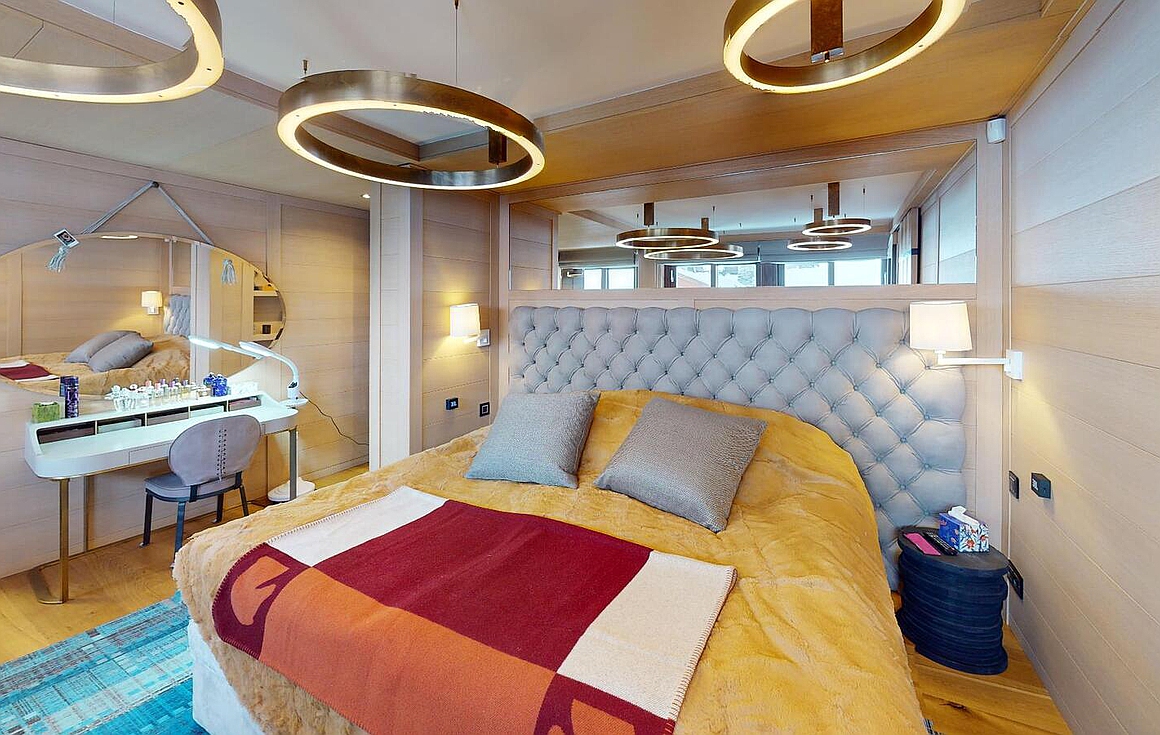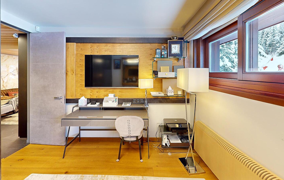 The master bedroom features a dressing room, shower room, and its own hammam, offering the ultimate relaxation after a day of skiing. A second double bedroom with en suite bathroom, a third bedroom, and a study provide ample accommodation for family or guests.