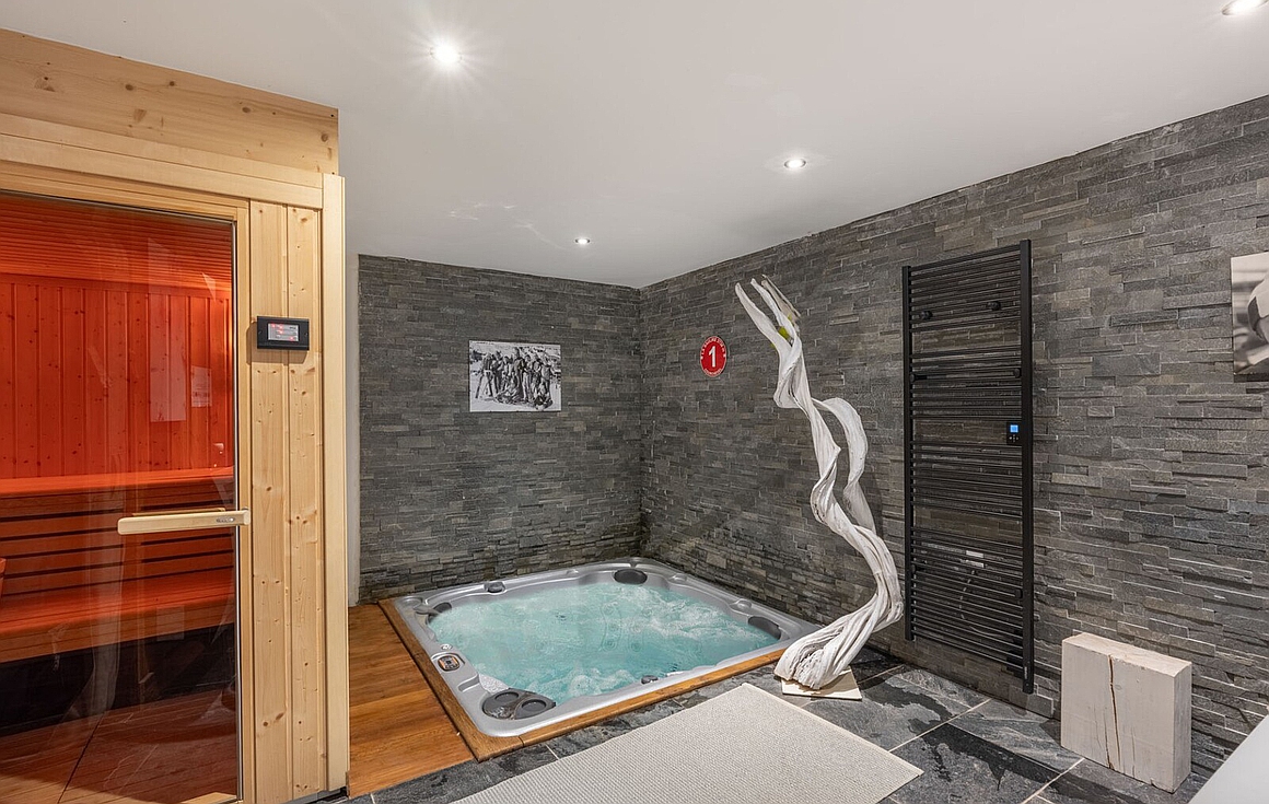 For moments of relaxation, the apartment includes a wellness area with a Jacuzzi, sauna, and shower, offering a tranquil escape after a day on the slopes. Practical features such as several covered parking spaces and a ski room/cellier provide convenience for residents.