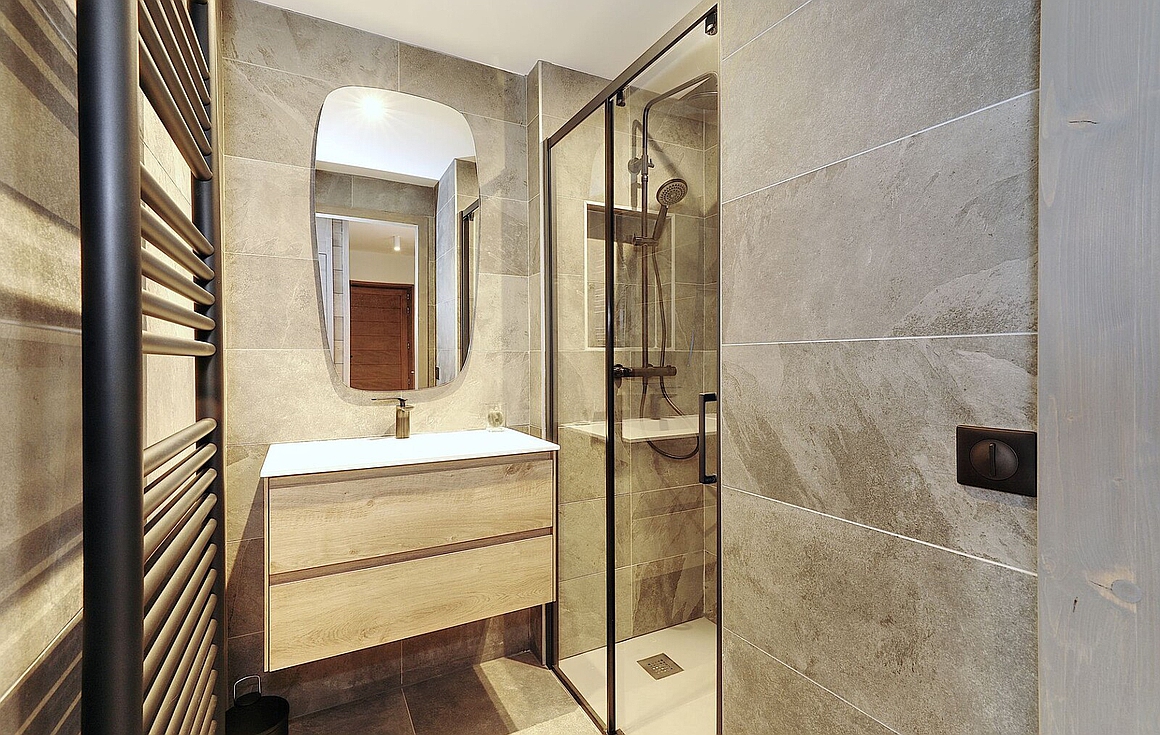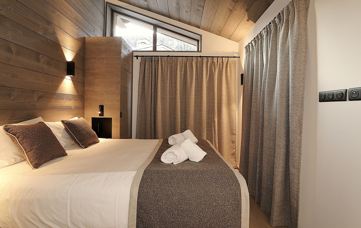The open-plan kitchen is fully equipped, ideal for preparing meals that can be enjoyed in the adjacent dining area. The cosy lounge with vaulted ceiling and large volumes of glass is a perfect place to unwind after a day on the slopes. At night, you’ll find a restful double bedroom and a second bedroom that can be configured as either a double or twin, catering to your needs.