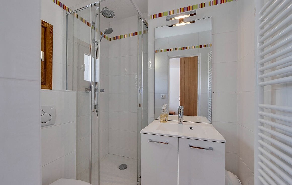 The main apartment offers a bright south-facing lounge, two bathrooms, two separate WCs, and a fully equipped kitchen. The studio includes a well-designed open-plan living and sleeping area, a bathroom, and its own kitchen, with serene lake and peak views. Together, the properties provide privacy and connection—ideal for alpine getaways or as a high-yield rental investment.