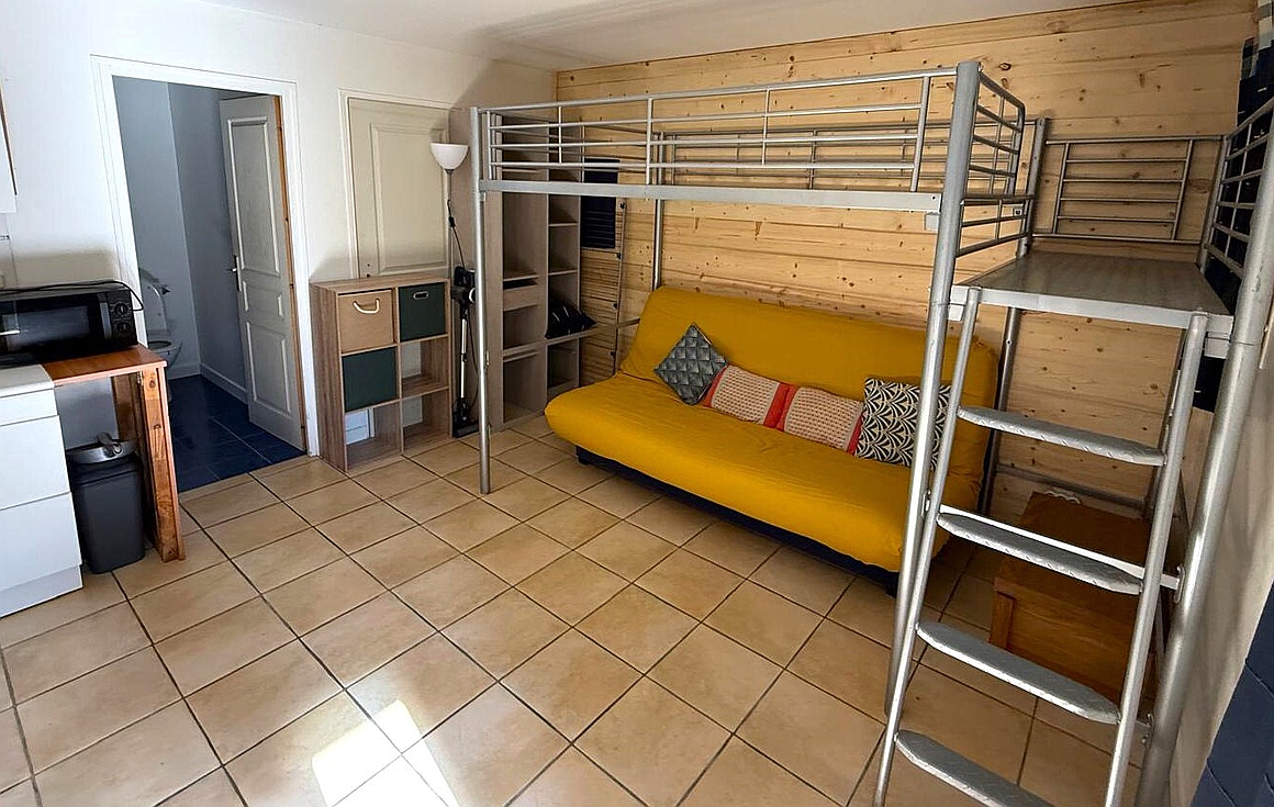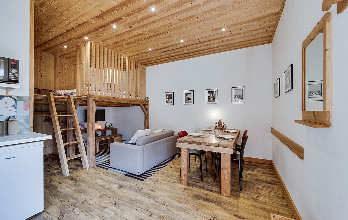 The heart of the chalet is a spacious open-plan living area with a feature fireplace and fully fitted kitchen, opening onto a generous terrace — the perfect spot to soak in panoramic views of snow-dusted peaks. The main accommodation includes two bright double bedrooms, one en-suite, a stylish family bathroom, and an alcove converted into an additional sleeping area. A separate entrance leads to two fully self-contained studios, ideal for guests, staff, or generating seasonal rental income.