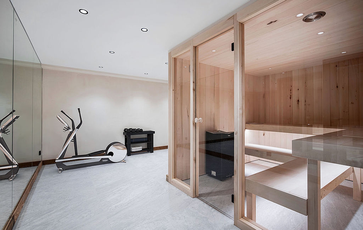 The spacious open-plan living area on the second level includes a stylish lounge and dining space with an enclosed fireplace, a fully equipped kitchen, and access to both a balcony and terrace that invite panoramic vistas and all-day sun. Designed for relaxed alpine living, the home includes a wellness suite with a six-person sauna and fitness area, as well as a ski room with boot warmers.