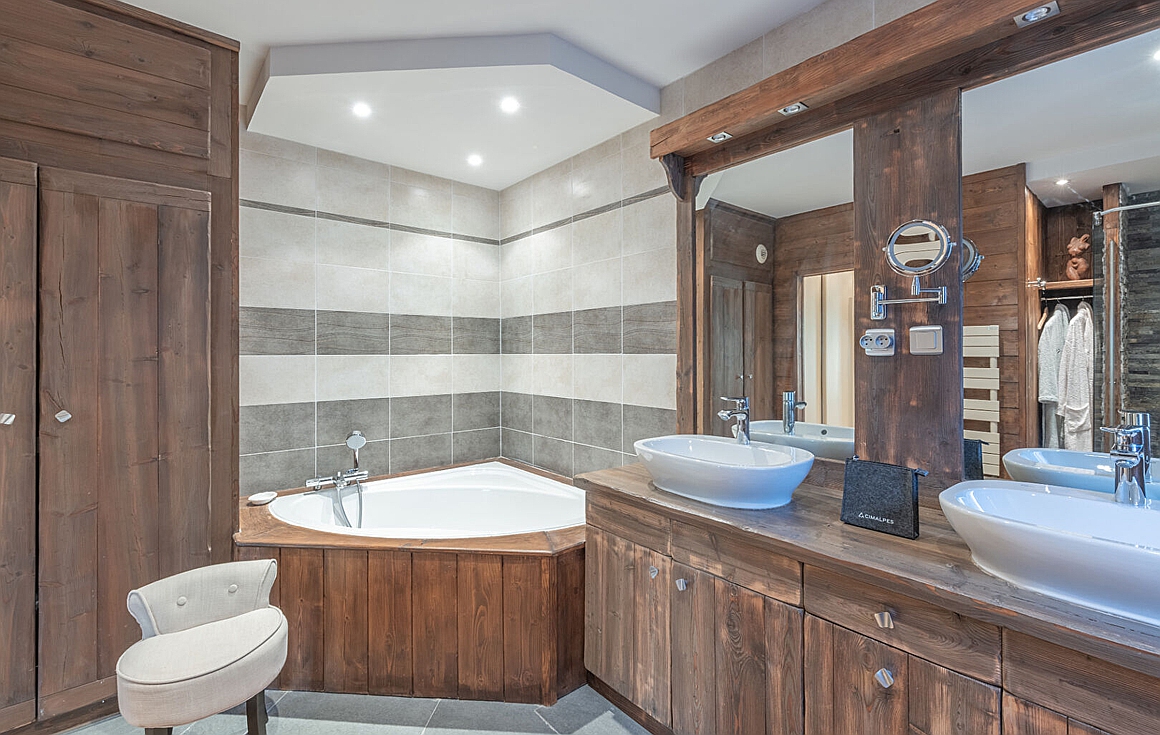 Each of the five bedrooms is paired with its own bathroom, ensuring privacy and luxury for family and guests alike. Beyond its charming aesthetic, this home features a jacuzzi, sauna, and generous relaxation area—perfect after a day on the slopes. A fireplace, underfloor heating, and quality natural materials complete the inviting alpine atmosphere.