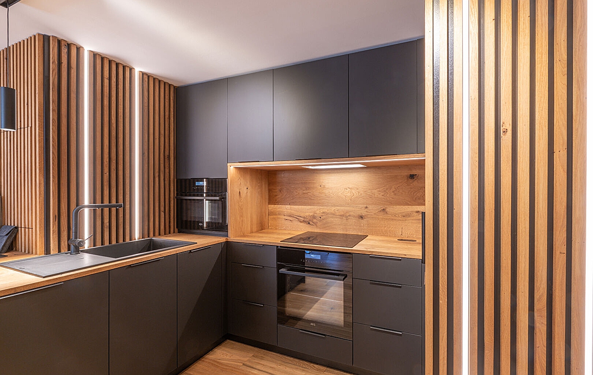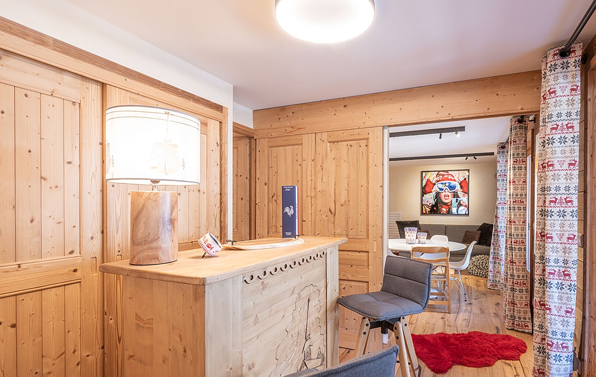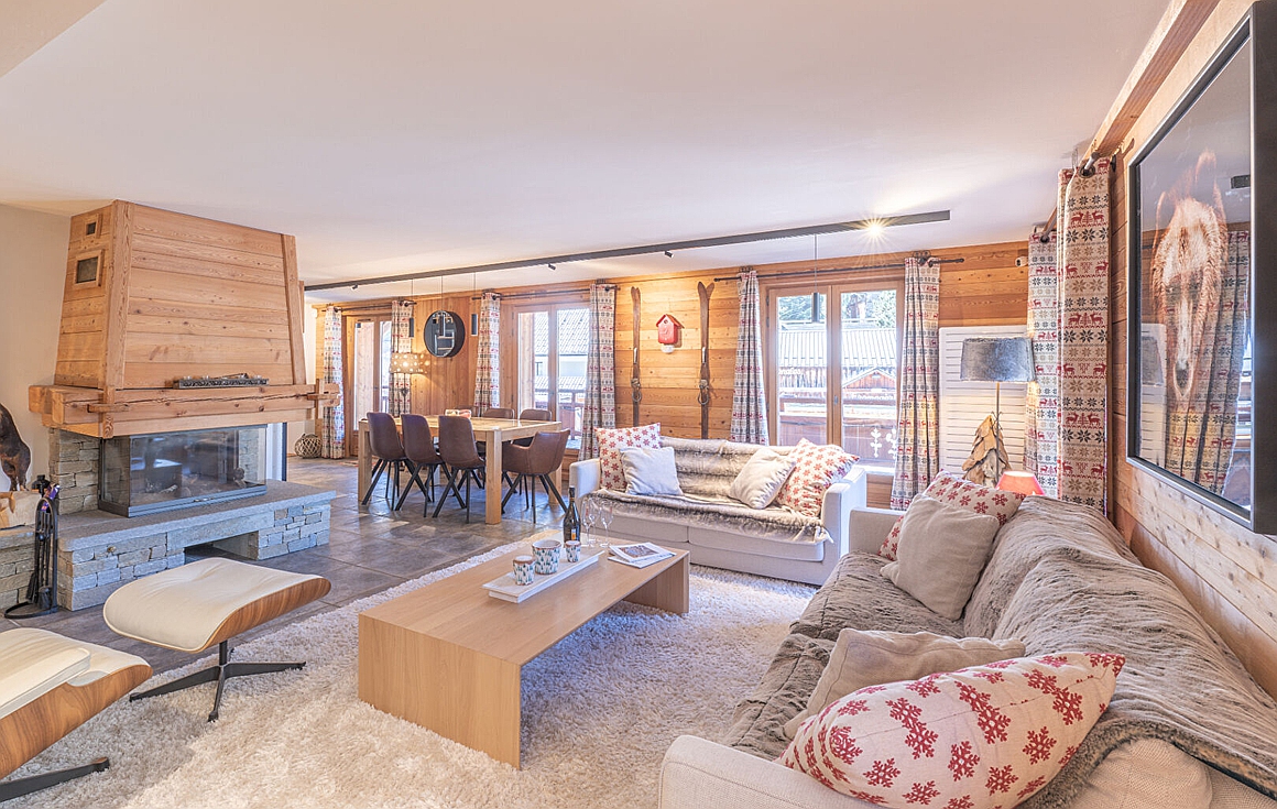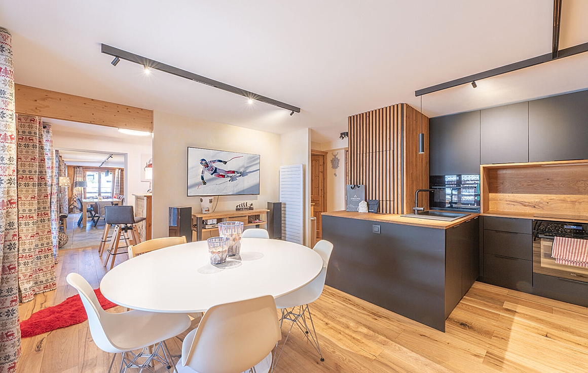 Situated just steps from the ski lifts and the bustling resort centre, the apartment provides easy access to world-class skiing and all-season lifestyle amenities. The interiors blend refined finishes with warm textures, creating a sophisticated yet welcoming mountain retreat. A chimney adds rustic charm, while the open-plan living and dining area fosters easy flow for family gatherings or après-ski evenings.