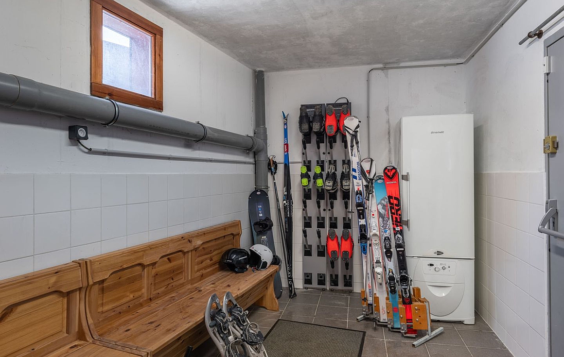 This apartment features five bedrooms, including an en-suite master bedroom, a family bedroom, and multiple bathrooms with four showers and one bathtub. The open-plan living and dining area with its fully equipped kitchen is perfect for hosting gatherings and enjoying quality time. A spacious terrace extends the living area, offering panoramic views of the surrounding mountains.