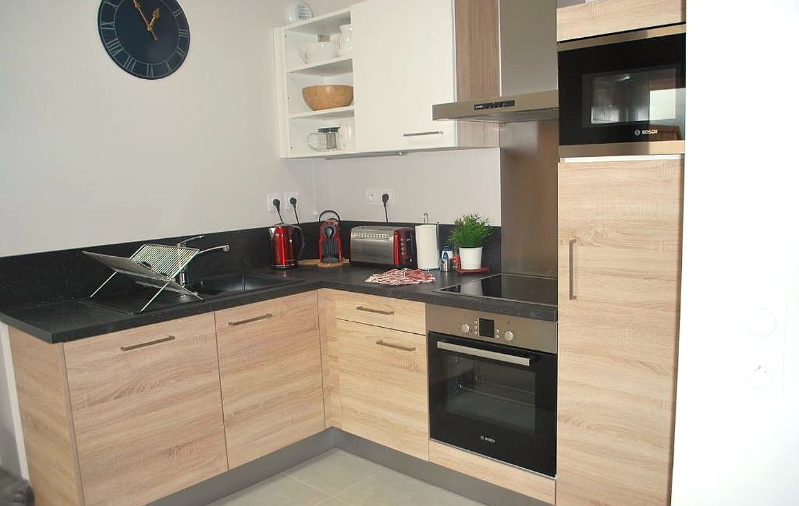 Found within a modern building completed in 2017 by a well known developer of the region, the warm atmosphere in the apartment enjoys a28m2 open plan living area under a vaulted wooden cathedral ceiling with fully fitted kitchen, dining area area and living room with access to the large balcony.