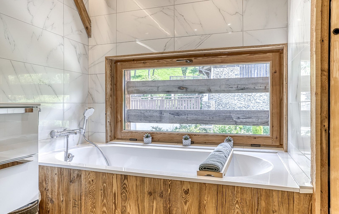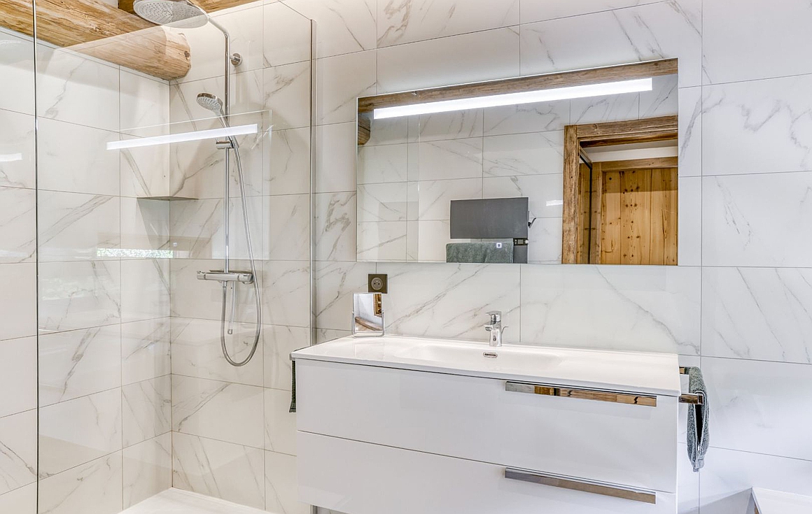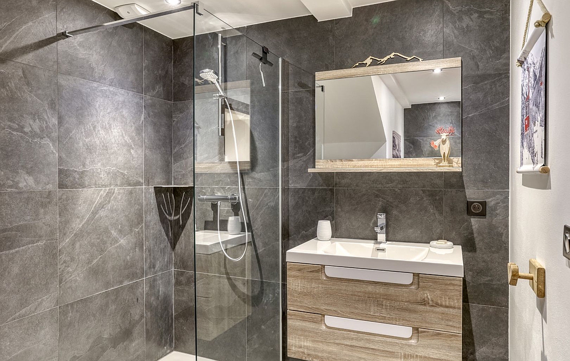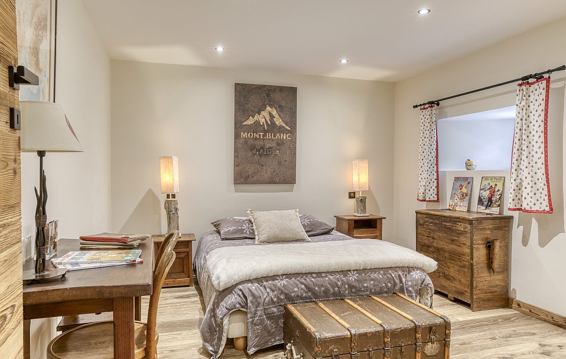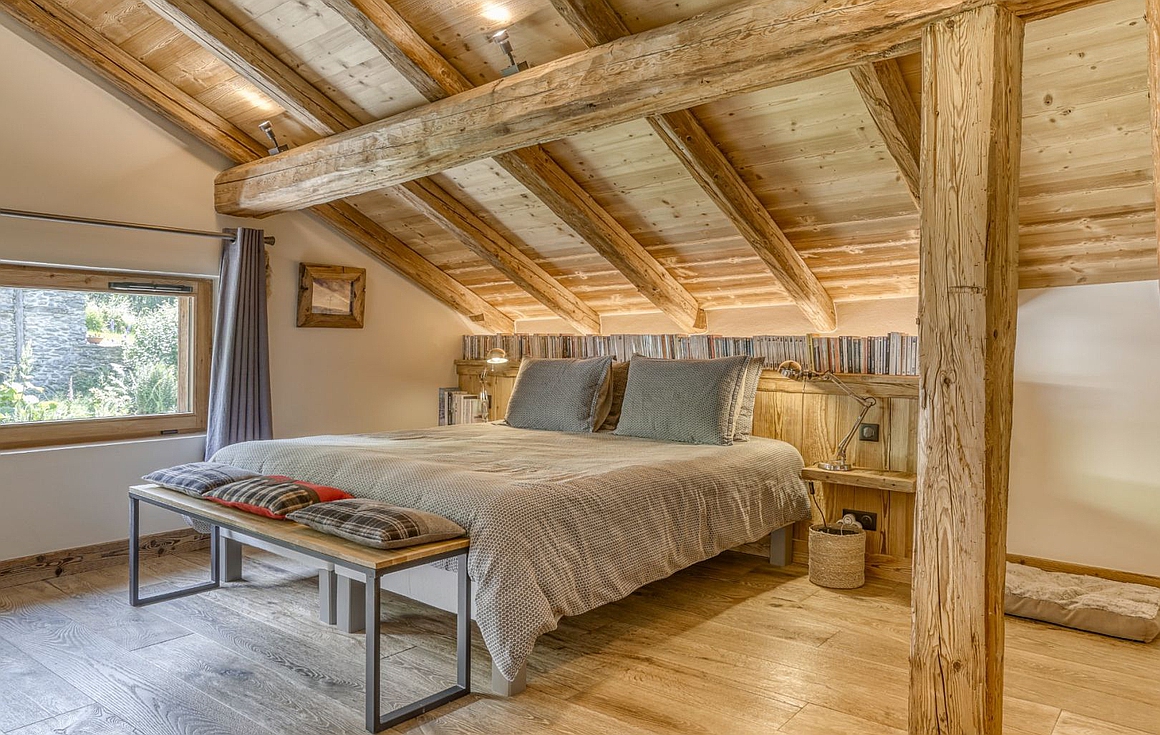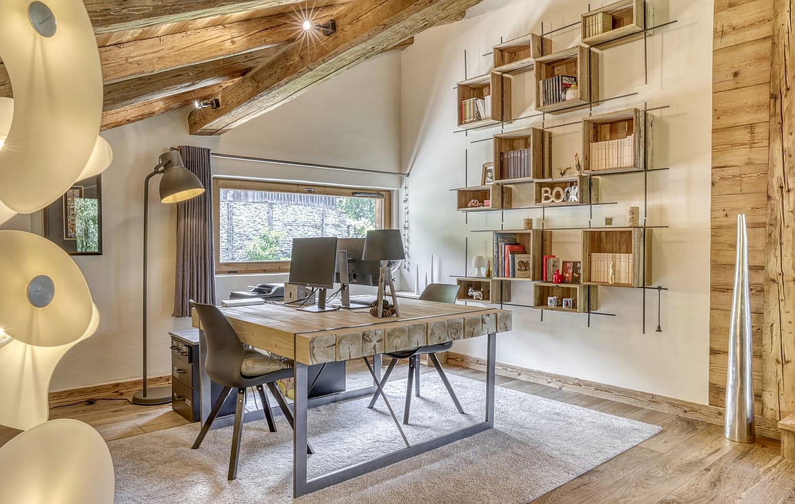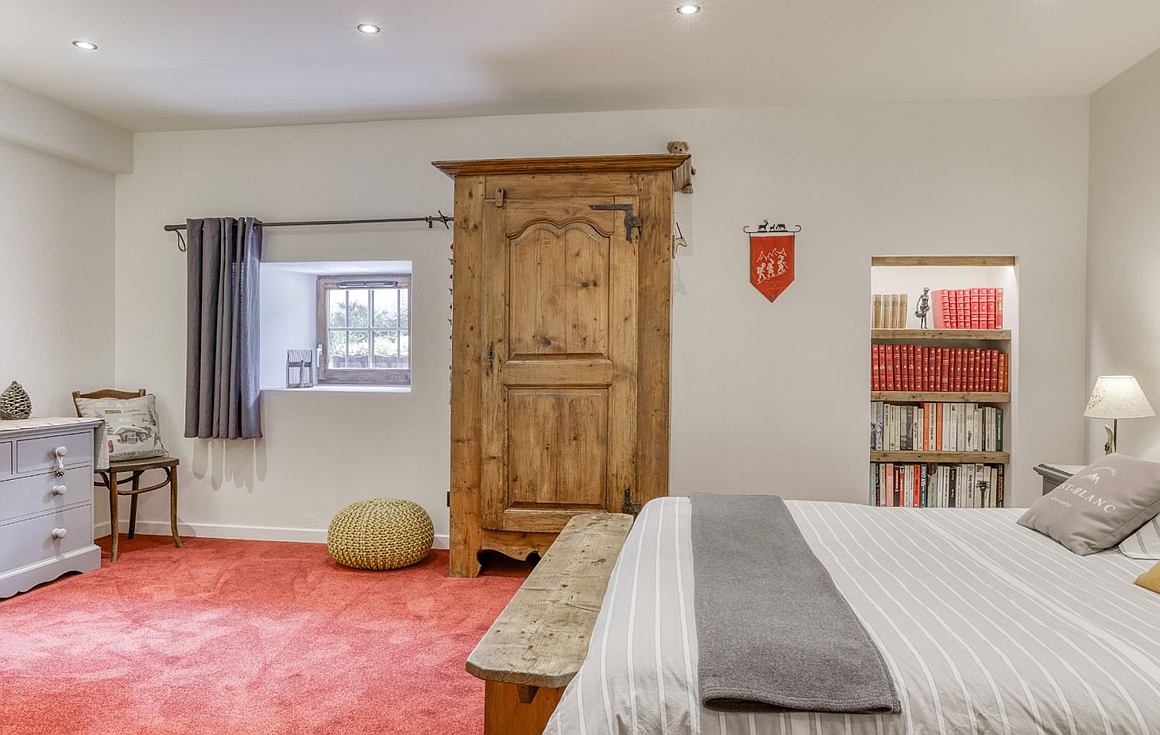 Dating back to 1850, the farmhouse has been meticulously restored across two levels, preserving its original character while enhancing comfort with high-end contemporary finishes. High ceilings, exposed beams, and generous volumes create an elegant and warm atmosphere, while the double-sided fireplace brings a welcoming mountain spirit to the living spaces. The property is sold fully furnished with carefully selected pieces that elevate its charm.