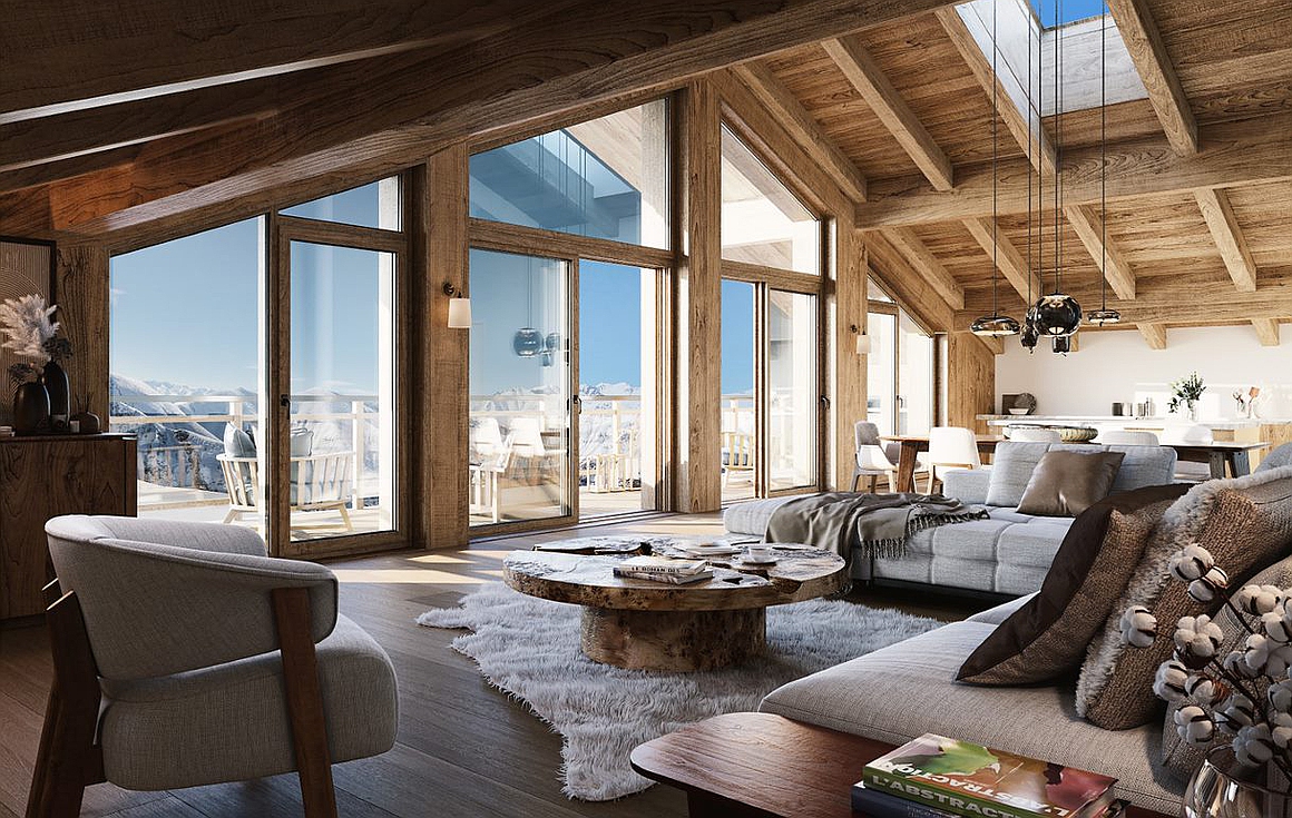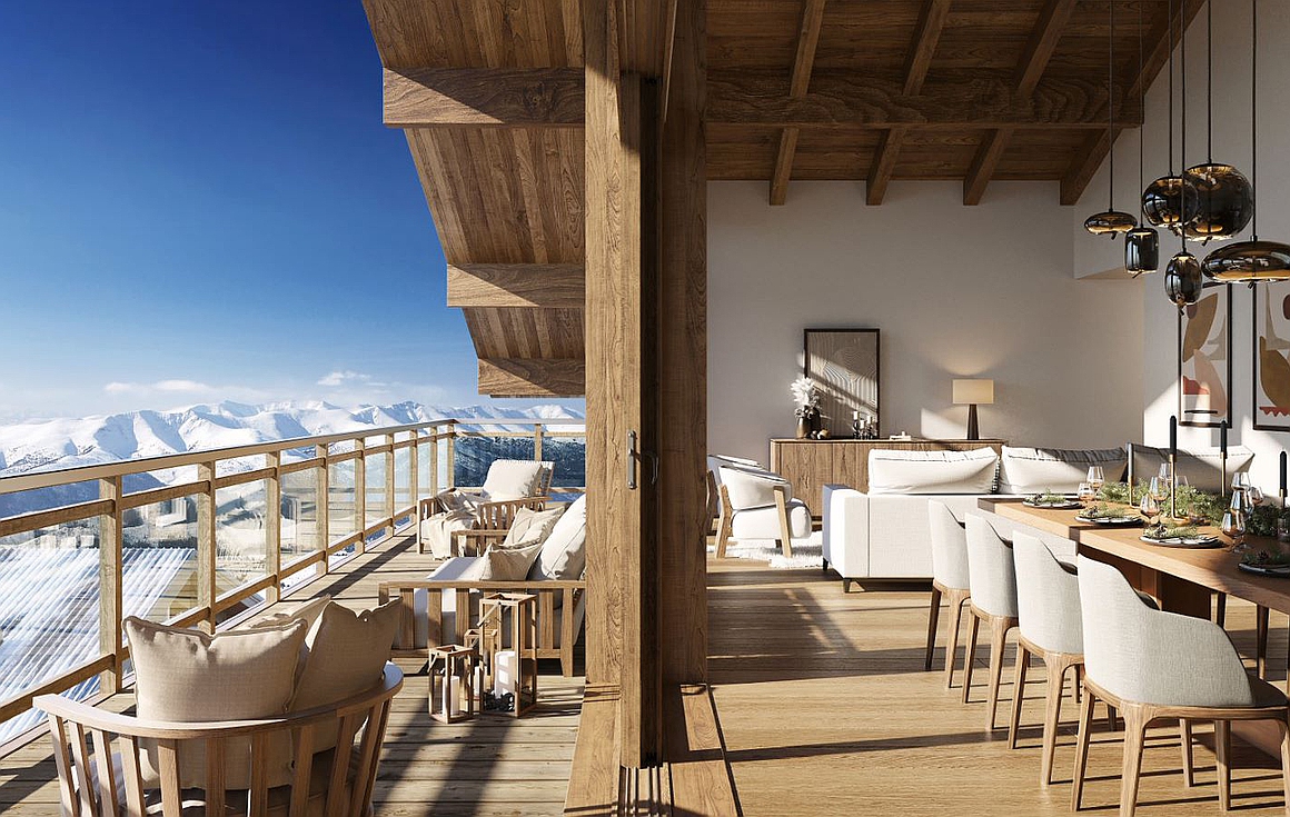 Three comfortable en-suite double bedrooms provide privacy and flexibility, while a mountain corner offers additional sleeping space for guests or family. A separate bathroom and WC complete the thoughtful layout. Outside, the generous south-west facing corner balcony becomes a natural extension of the living area, perfect for soaking up panoramic views and long alpine sunsets.