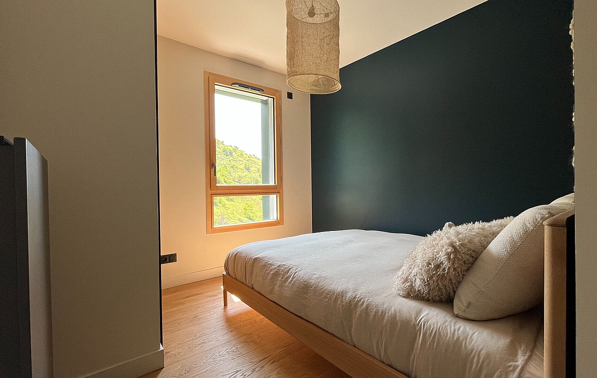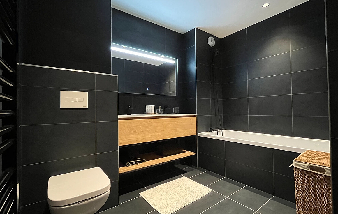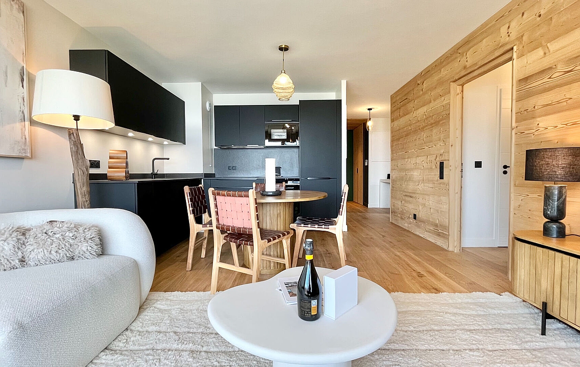 Designed with clean architectural lines and noble materials, the interior blends contemporary comfort with authentic mountain character. The bright living area is bathed in natural light and opens onto a generous south-facing balcony, inviting long lunches and peaceful moments outdoors throughout the seasons. The layout has been thoughtfully designed to balance shared living and privacy, with three well-proportioned bedrooms, a bathroom with WC, and two additional shower rooms, ideal for family stays or hosting guests.