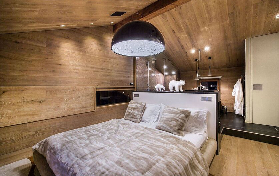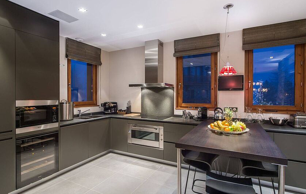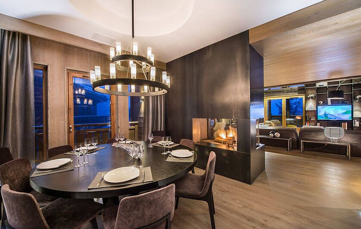 Crafted with high-quality materials and impeccable attention to detail, the interiors combine elegance with comfort. The heart of the chalet is the expansive living area, where a striking fireplace anchors convivial evenings after a day on the slopes. The fully equipped modern kitchen opens seamlessly onto the living space, making it perfect for entertaining and shared moments.