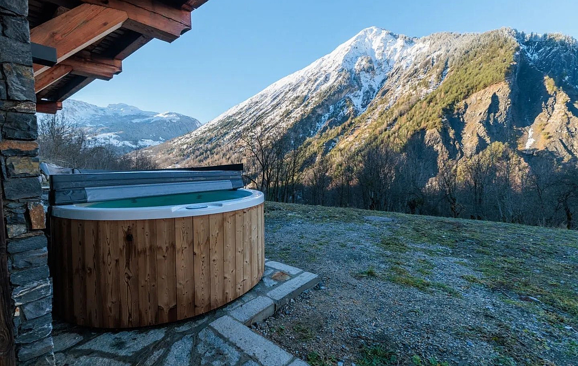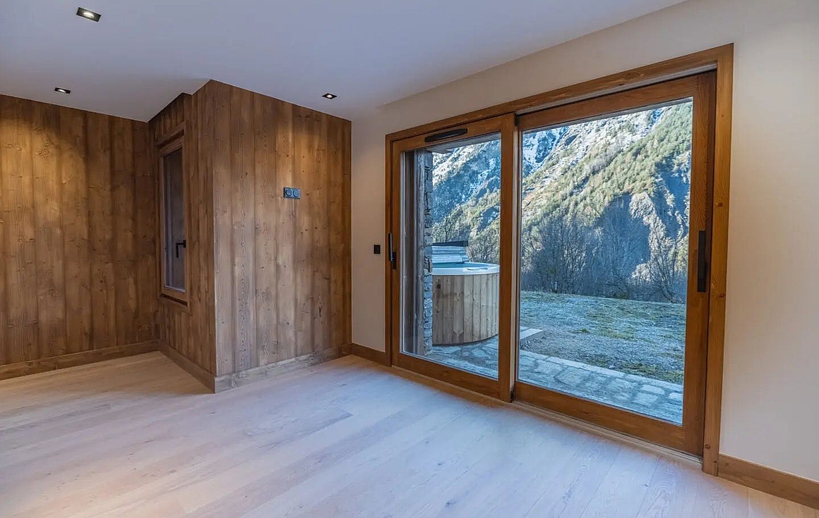 The main living space is designed for both relaxation and connection. A generous open-plan layout brings together the kitchen, dining area, and lounge, all bathed in natural light thanks to multiple openings and direct access to terraces. These outdoor spaces extend the living experience, culminating in a large west-facing terrace where evenings naturally unfold around the jacuzzi, with sunsets over the valley as your backdrop.