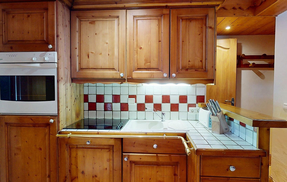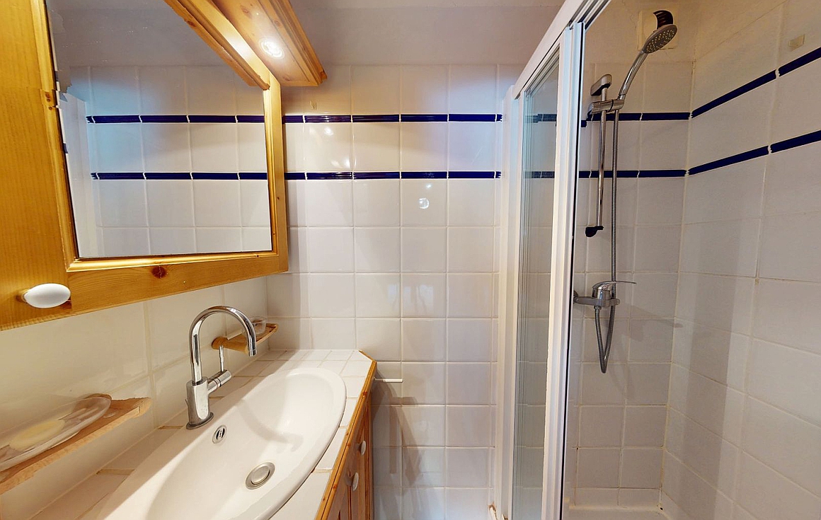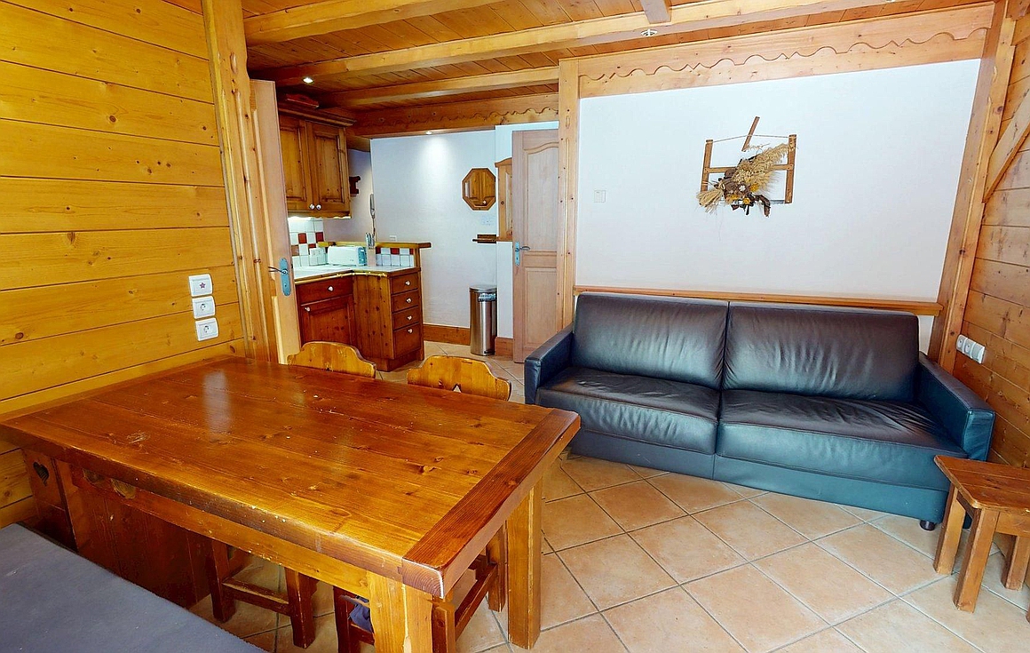 The living space is warm and well laid out, with a cosy lounge and kitchenette opening onto a balcony, perfect for soaking up the alpine atmosphere after a day on the snow. The sleeping area includes two bedrooms, one with its own en-suite shower room, complemented by a separate bathroom and WC, offering comfort and privacy for family or guests.