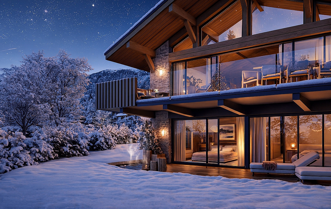 Built over three levels, the chalet unfolds through generous, light-filled volumes designed for both convivial gatherings and peaceful retreat. The main living area forms the true heart of the home, where expansive openings frame the surrounding peaks and bathe the interiors in natural light. A fireplace enhances the warm atmosphere, while high-end finishes and noble materials elevate every detail.