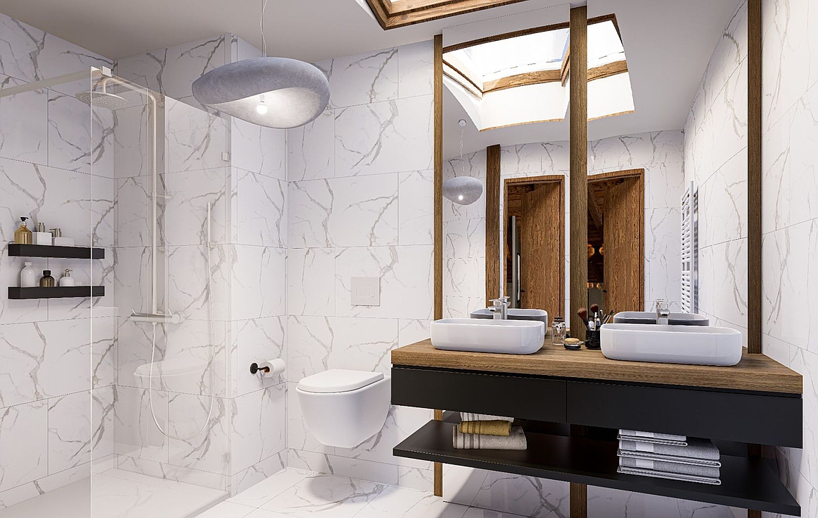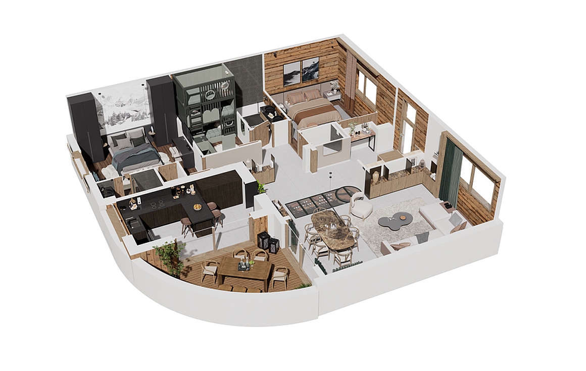 The entrance opens onto a welcoming hall with dressing area, leading into a vast living and dining space framed by large bay windows. Sunlight pours in throughout the day, extending the interior seamlessly onto a spacious 17 sqm south-west terrace, ideal for long summer evenings with views of the surrounding peaks. The fully equipped kitchen integrates effortlessly into the living area, creating a warm and convivial atmosphere.